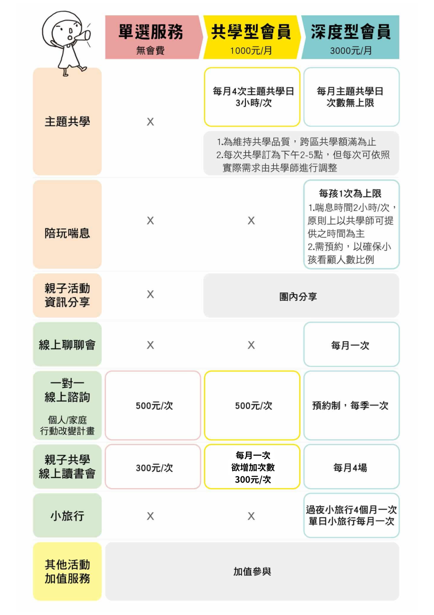 「親子共學線上讀書會」可跨區報名,深度型會員每月四個場次,平日兩場、假日兩場,無名額限制,共學型會員可每月參與一次,已包含於會員費中。可另外加值費用後參與,每次300元。